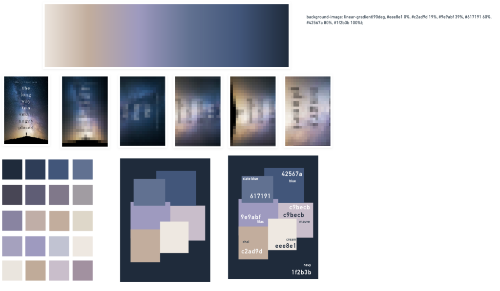 For this project I used a technique that I talk about in this blog post. You can see that the final version of this website it looks like a very direct interpretation of the cover of the original book. I was unsure on first on being this obvious with the colour palette, as I often like to use projects as an opportunity to express my creativity. However, once I had used this method to extract these colours, they were just too aesthetically pleasing to ignore.