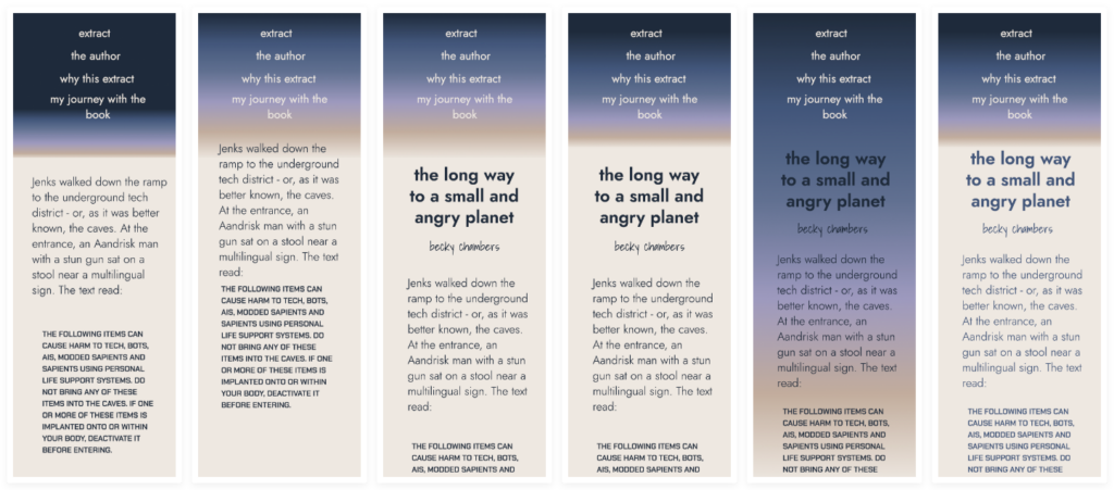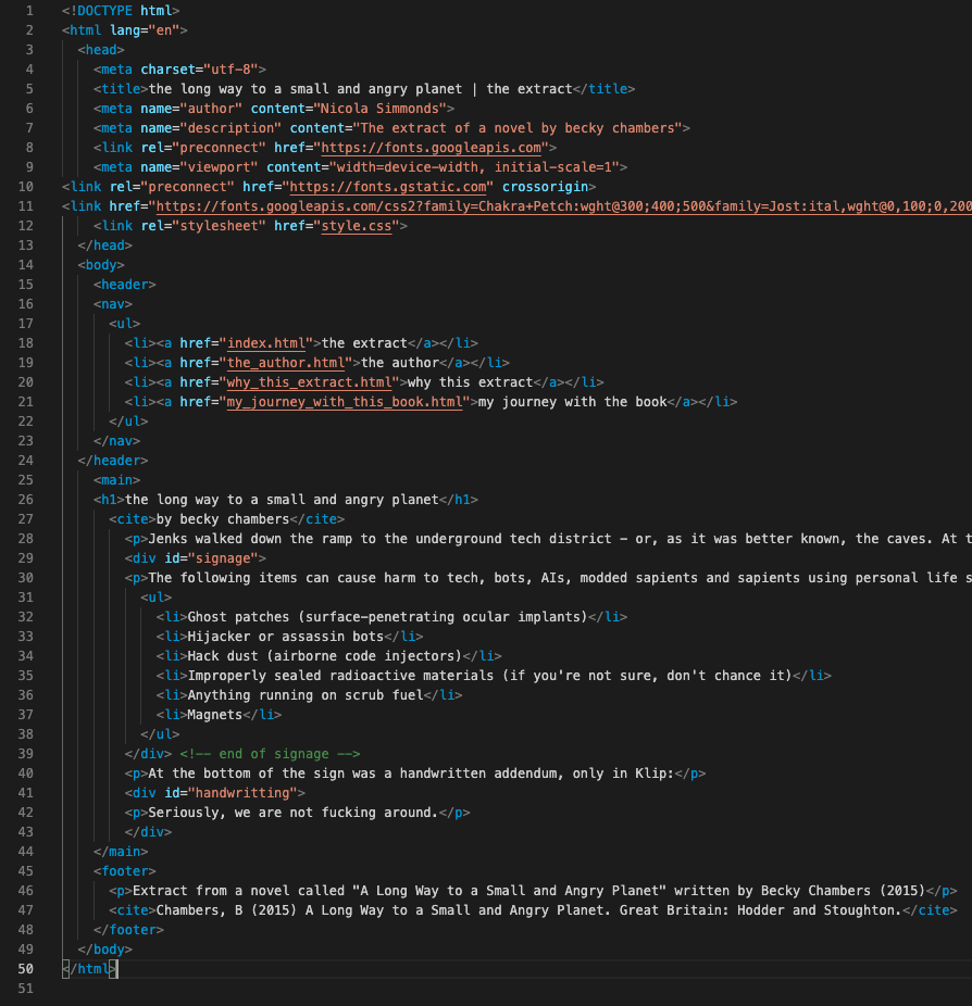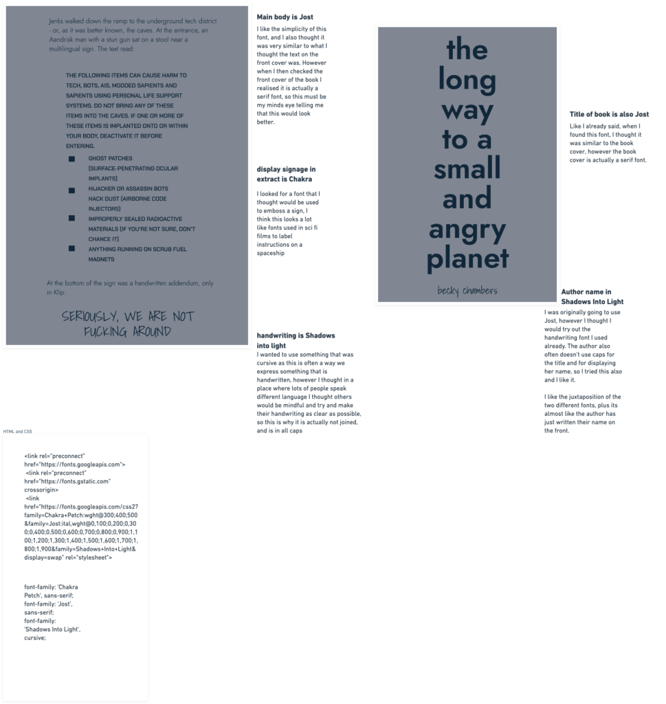 The purpose of the project was to use the fonts and the typography to express the book extract. I am currently very fond of using sans serif fonts so I started the process with using the title of the book as a phrase to search through the google fonts console. The font Jost had an amazing variety of weights. Using the boldest of Jost for the titles and a much lighter weight for the main text gave a great variation, it can be common to use a display font for a title, however I have instead used the layout and weight of the font to express the hierarchy of the main heading.